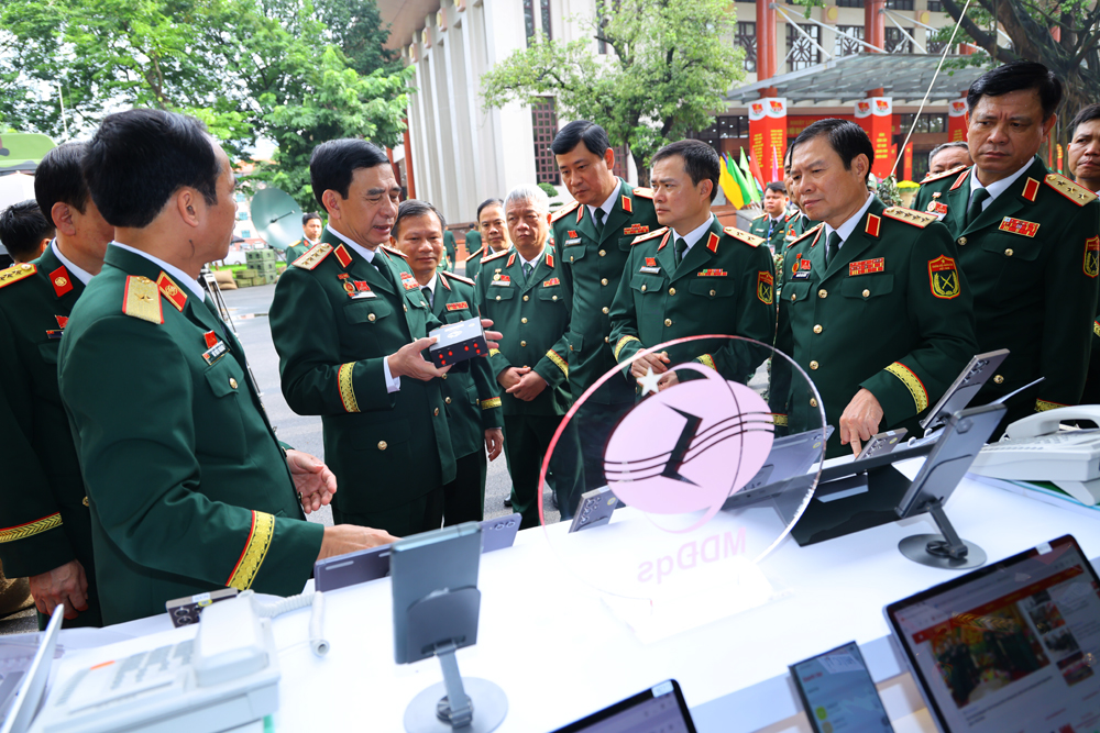 Đại tướng Phan Văn Giang cùng lãnh đạo Bộ Quốc phòng và các đại biểu tham quan các gian trưng bày phục vụ đại hội.