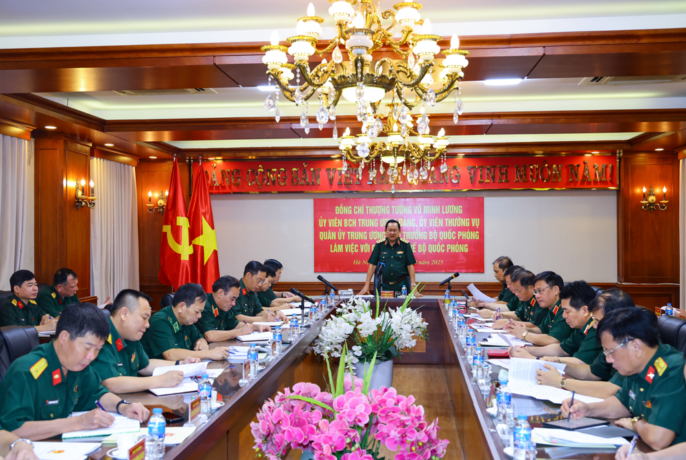 (Bqp.vn) - Sáng 3/10, tại Hà Nội, Thượng tướng Võ Minh Lương, Ủy viên Trung ương Đảng, Ủy viên Thường vụ Quân ủy Trung ương, Thứ trưởng Bộ Quốc phòng đã làm việc với Cục Pháp chế Bộ Quốc phòng về kết quả thực hiện nhiệm vụ 9 tháng đầu năm 2025 và phương hướng, nhiệm vụ trong thời gian tới. Cùng dự buổi làm việc có Thượng tướng Phùng Sĩ Tấn, Phó Tổng Tham mưu trưởng QĐND Việt Nam; đại diện một số cơ quan, đơn vị có liên quan.