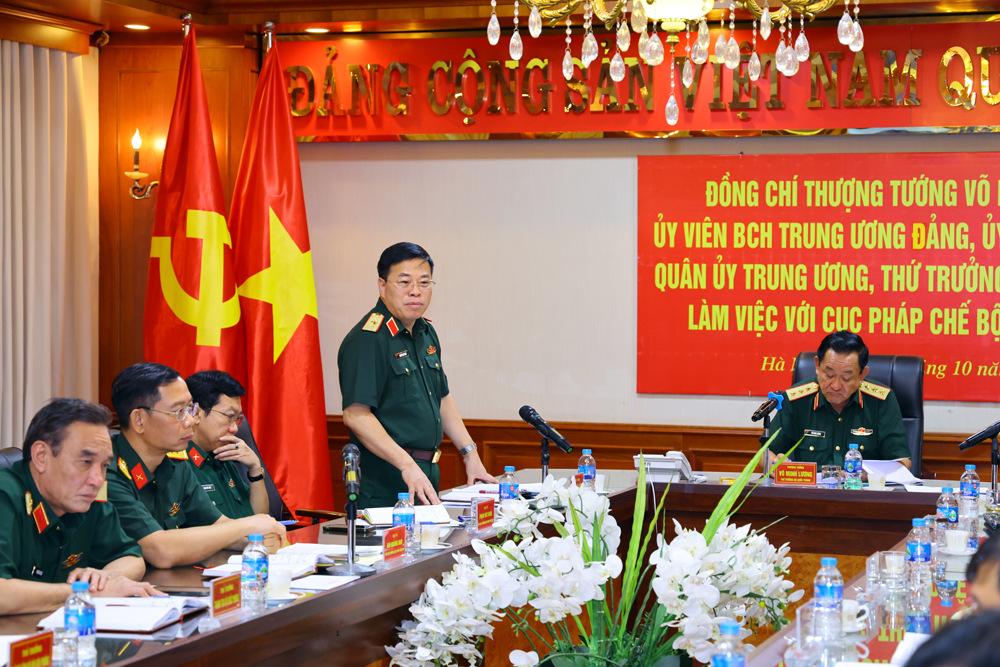 Phát biểu kết luận buổi làm việc, Thượng tướng Võ Minh Lương biểu dương nỗ lực, kết quả công tác mà Cục Pháp chế Bộ Quốc phòng đã đạt được trong thời gian qua, đặc biệt là việc tham mưu xây dựng, hoàn thiện hệ thống văn bản pháp luật liên quan đến lĩnh vực quân sự, quốc phòng. Thượng tướng Võ Minh Lương yêu cầu Cục Pháp chế Bộ Quốc phòng tiếp tục phát huy hơn nữa vai trò cơ quan chủ trì, tham mưu chiến lược về công tác pháp luật trong Quân đội; chủ động phối hợp chặt chẽ với các cơ quan, đơn vị có liên quan để kịp thời tháo gỡ khó khăn, vướng mắc, bảo đảm ổn định về tổ chức, biên chế và cơ sở vật chất, hoàn thành tốt nhiệm vụ được giao. Coi trọng việc tập huấn, bồi dưỡng nâng cao chất lượng cán bộ, nhân viên đáp ứng yêu cầu trước mắt và lâu dài.