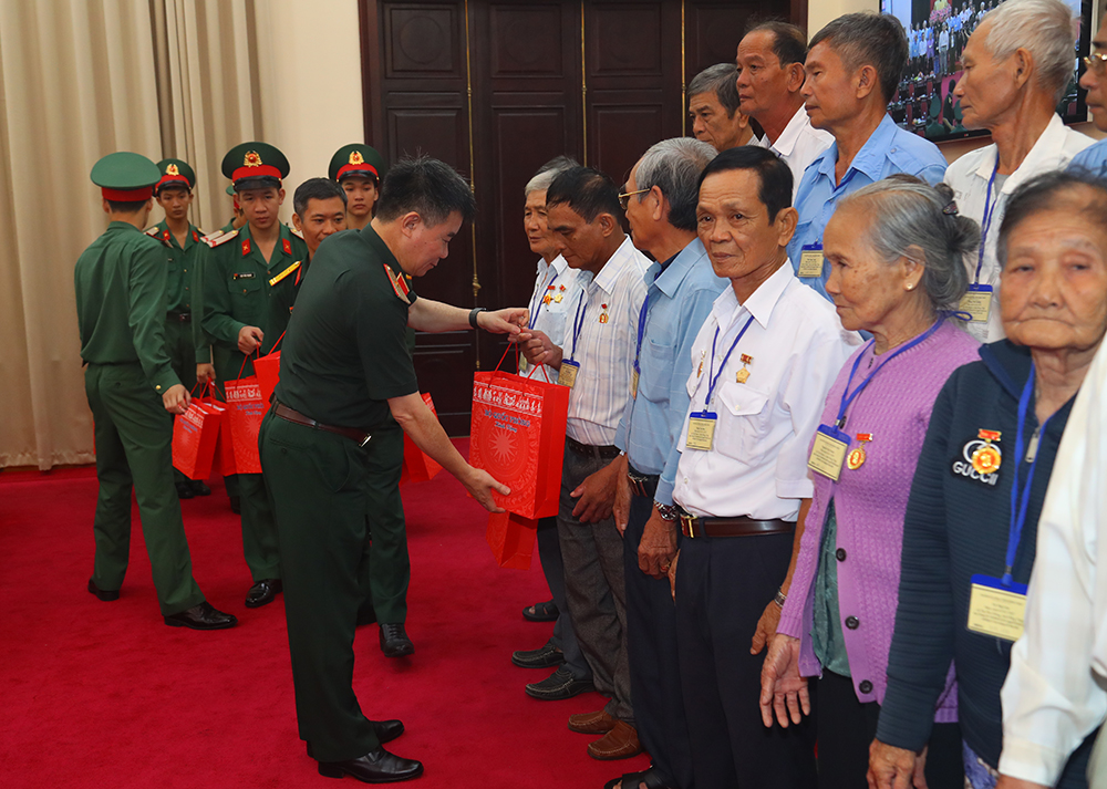 Thiếu tướng Đoàn Quang Hòa trao quà của Bộ Quốc phòng tặng các đại biểu người có công với cách mạng tỉnh Đồng Tháp.