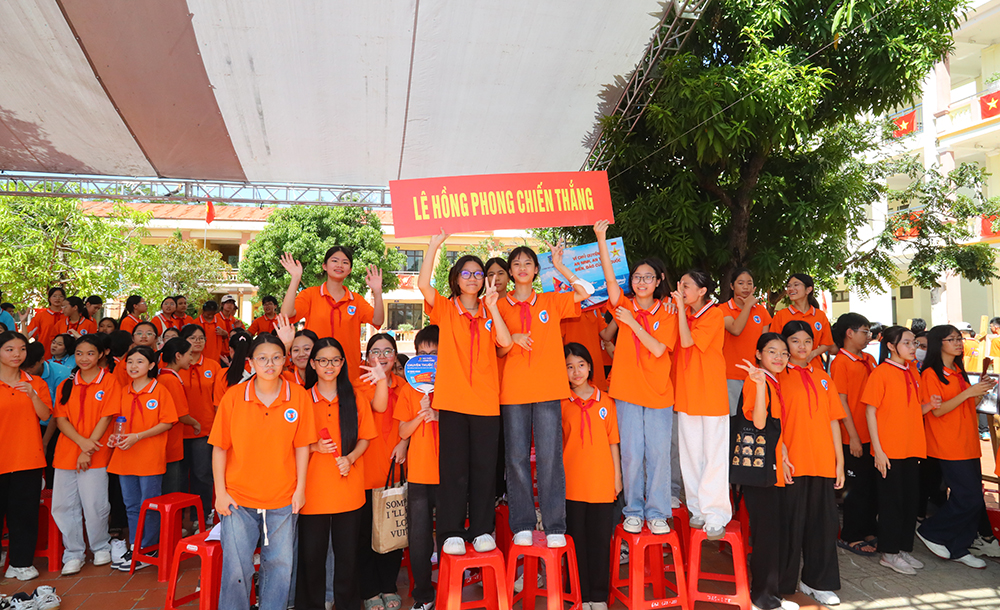 Các em học sinh Trường THCS Lê Hồng Phong cổ vũ cho đội của trường mình tại Cuộc thi “Em yêu biển, đảo quê hương”.