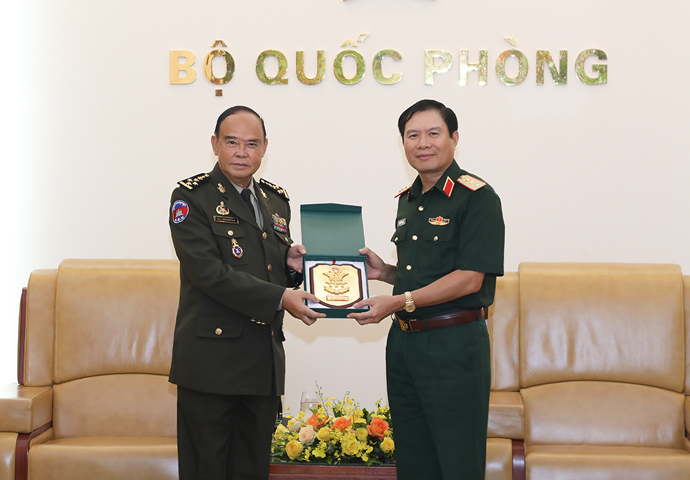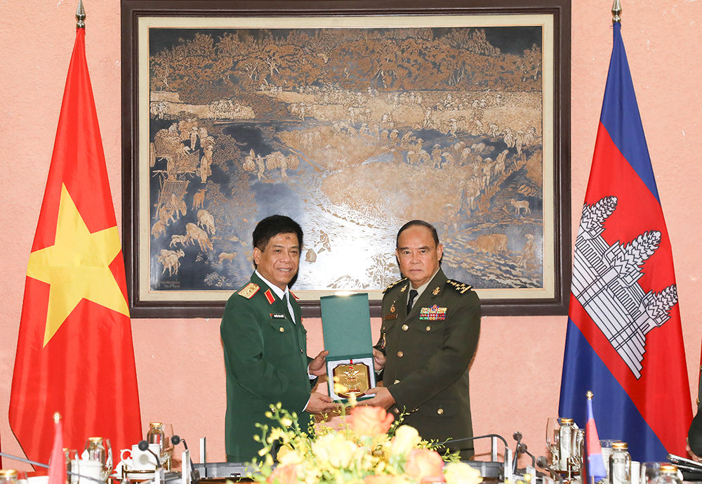 Thượng tướng Nguyễn Văn Nghĩa trao quà lưu niệm tặng Đại tướng Mao Sophan.