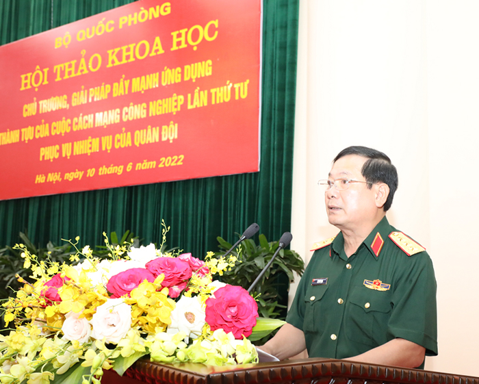 Thượng tướng Lê Huy Vịnh phát biểu kết luận tại Hội thảo khoa học Chủ trương, giải pháp đẩy mạnh ứng dụng của cuộc CMCN4.0 phục vụ nhiệm vụ của Quân đội, tháng 6/2022.