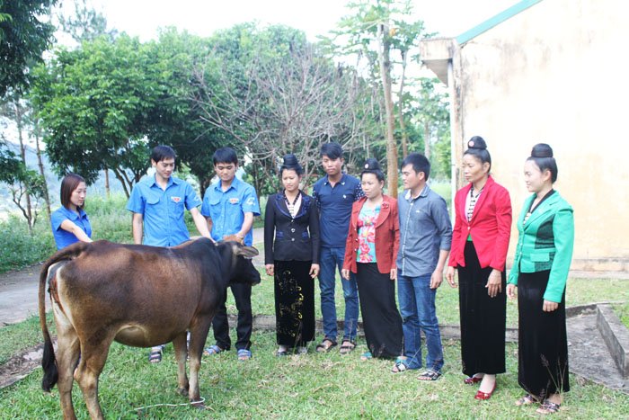 Trí thức trẻ tình nguyện Đoàn KT-QP 326 hướng dẫn kỹ thuật chăm sóc bò sinh sản cho nhân dân trong vùng dự án.